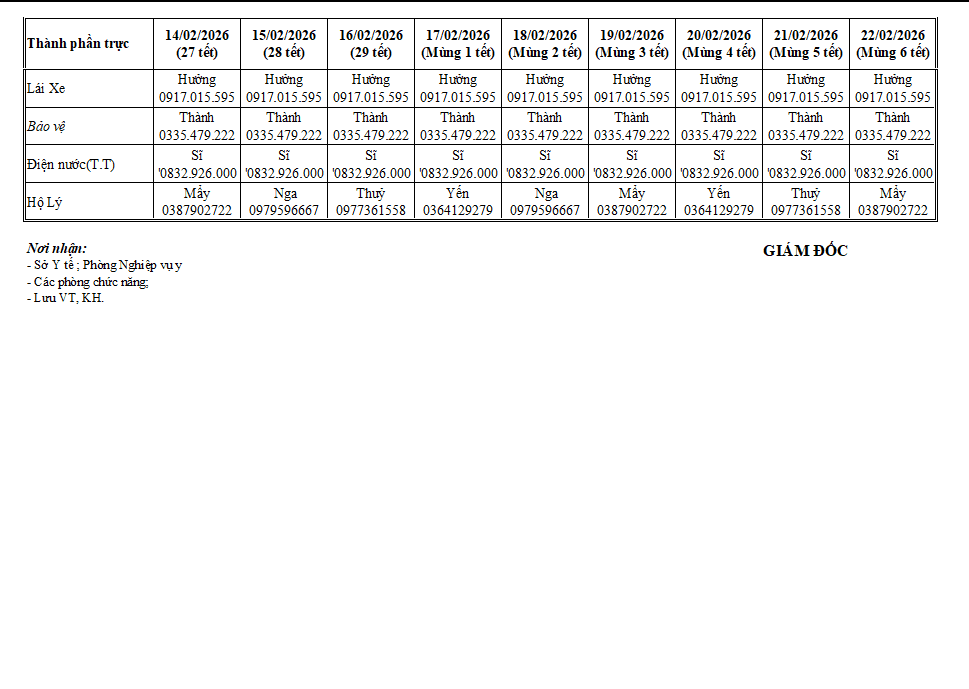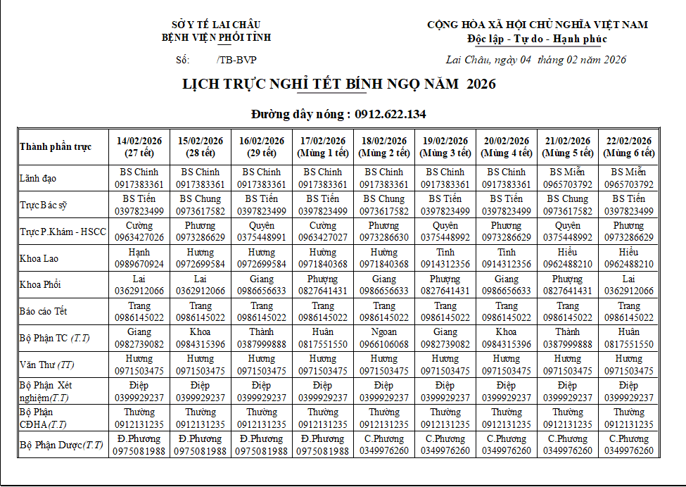 LỊCH TRỰC TẾT BÍNH NGỌ 2026 (Từ ngày 14- 22/02/2026)