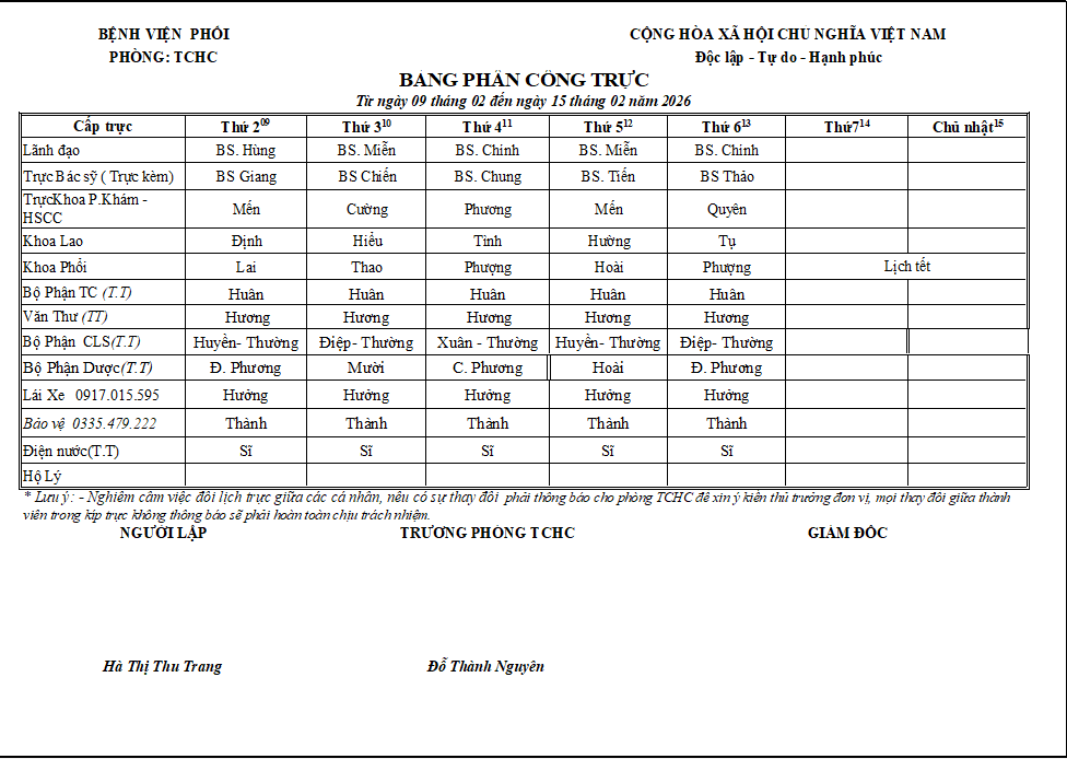 Lịch trực tuần từ 09-15/02/2026 Ngày đăng: 05/02/2026 44 lượt xem Danh sách file (1 files) Tải về9-15_9a358480b4.xls Mô tả:
