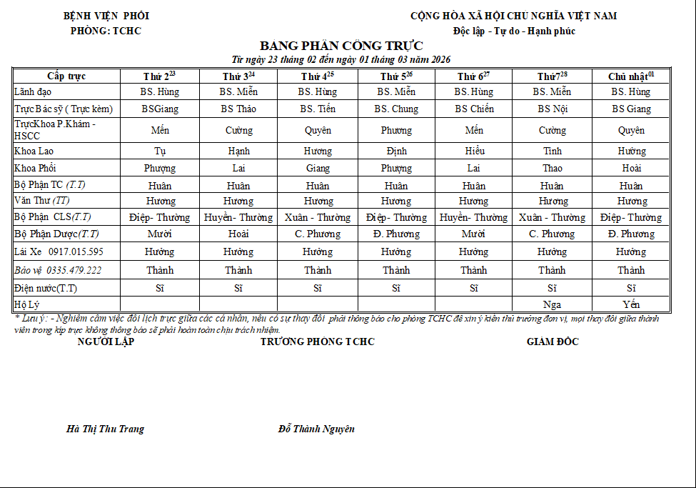 Lịch trực tuần từ ngày 23/02 -01/03/2026 Ngày đăng: 05/02/2026 72 lượt xem Danh sách file (1 files) Tải về23-01_dc68242323.xls Mô tả: