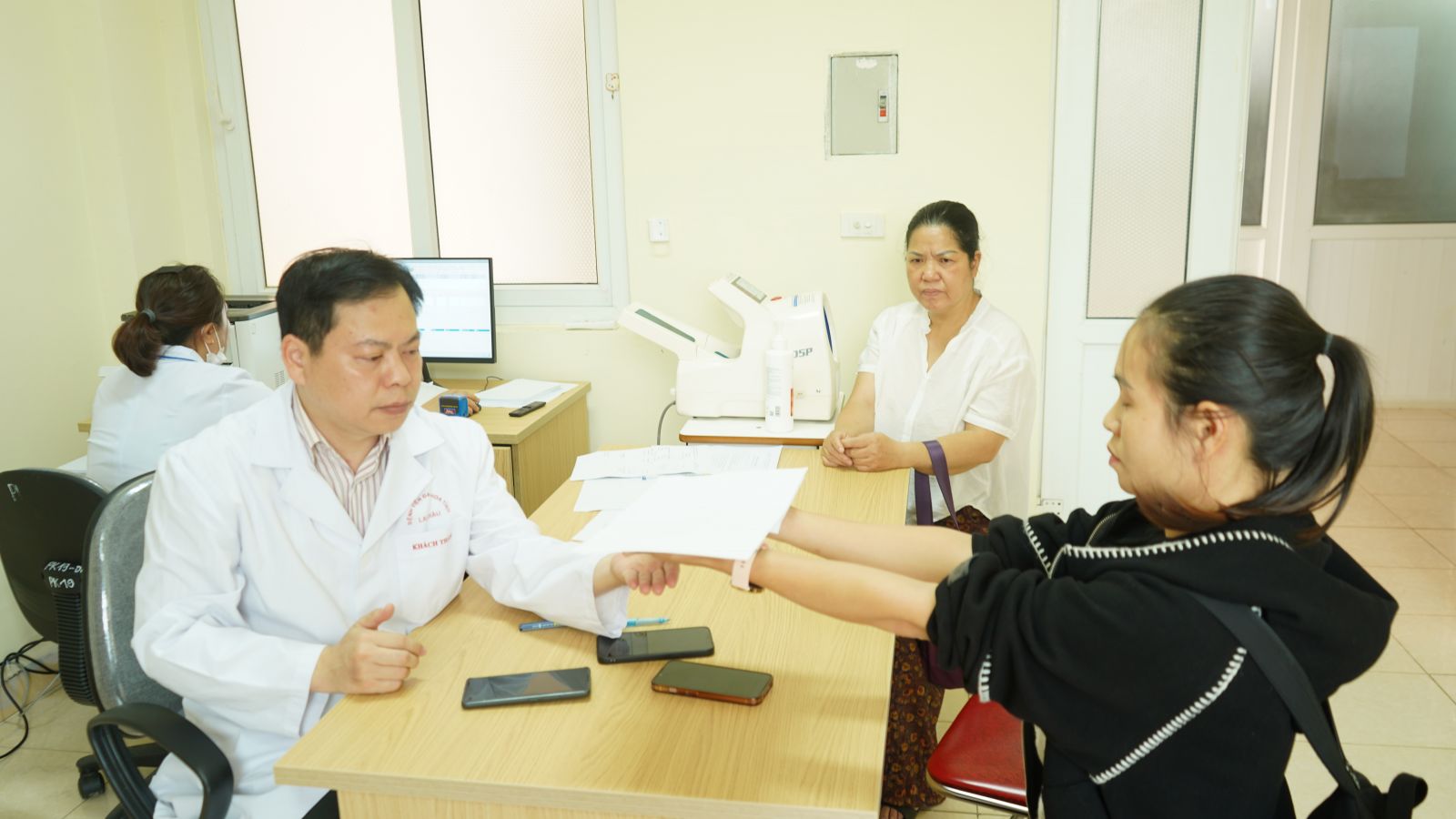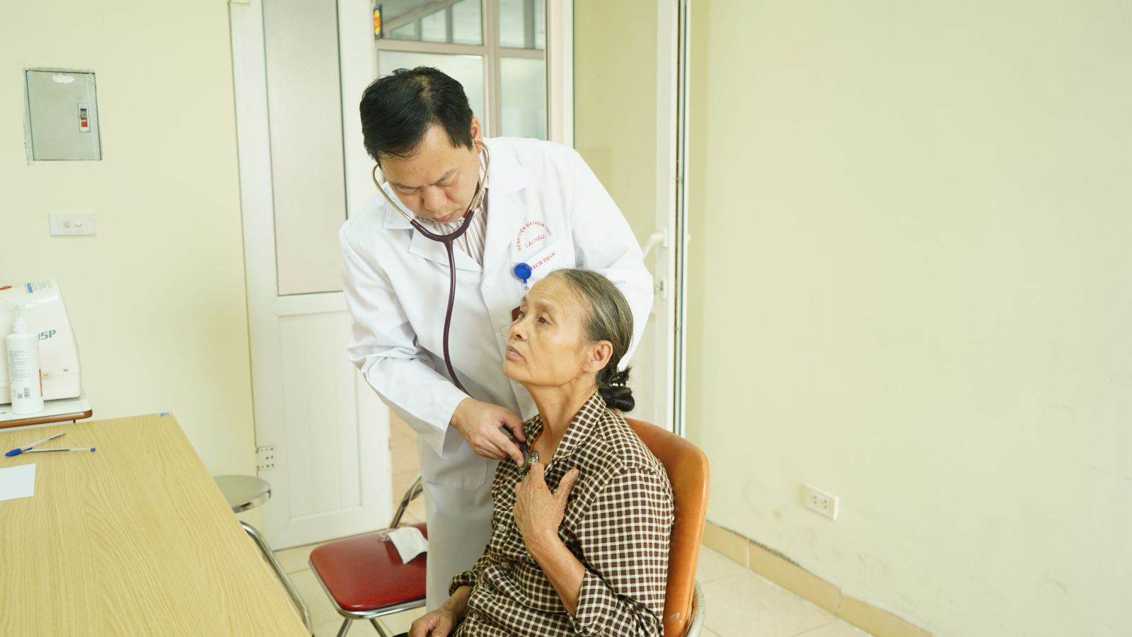 TS, BS Chu Dũng Sỹ - Trưởng khoa Hồi sức chống độc - Bệnh viện Đại học Quốc gia Hà Nội trực tiếp khám, tư vấn cho các bệnh nhân về các bệnh lý Ung bướu và Y học hạt nhân, khám tim mạch bao gồm quy trình toàn diện từ khám lâm sàng đến cận lâm sàng (điện tâm đồ ECG, siêu âm tim, xét nghiệm máu, X-quang) nhằm đánh giá chức năng tim, cấu trúc van tim, cơ tim và các yếu tố nguy cơ như mỡ máu, tiểu đường… Trong thời gian 01 ngày đã khám và tư vấn cho 12 bệnh nhân chủ yếu là mắc các bệnh về tim mạch.
