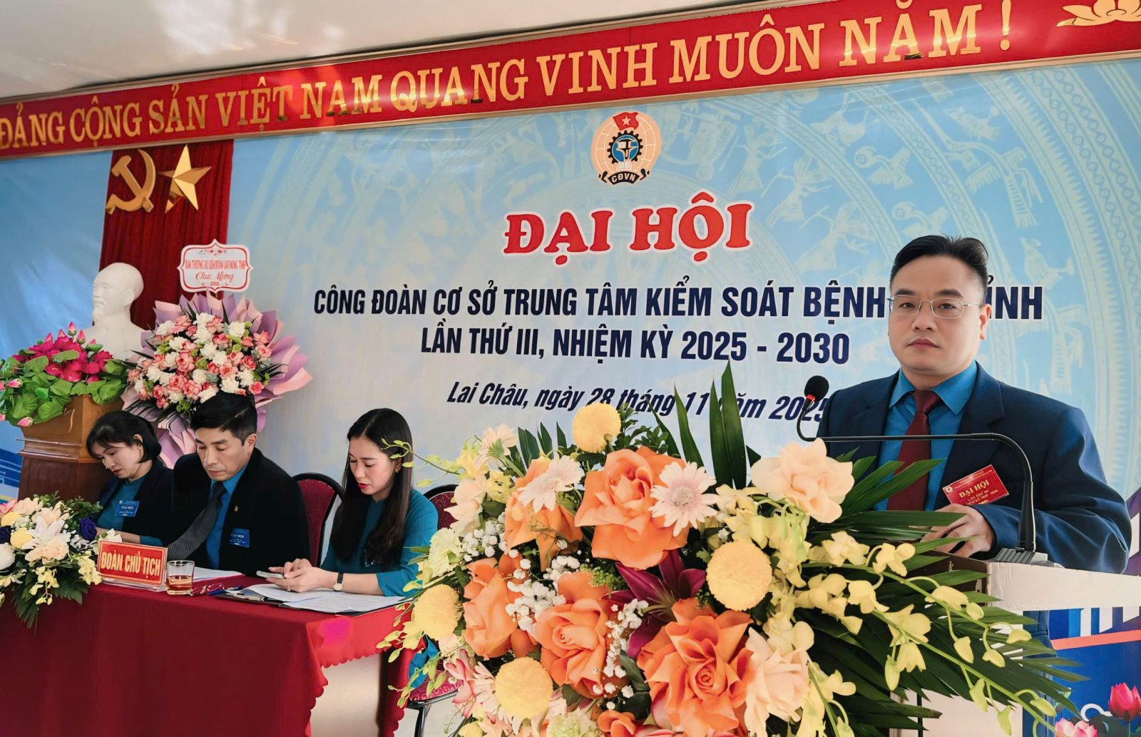 Chiều ngày 28/11, Công đoàn cơ sở (CĐCS) Trung tâm Kiểm soát bệnh tật tỉnh tổ chức Đại hội CĐCS lần thứ III, nhiệm kỳ 2025 - 2030. Dự đại hội có đồng chí Lương Xuân Trường - Phó Chủ tịch Liên đoàn Lao động tỉnh, đồng chí Trần Đỗ Kiên – Bí thư Đảng bộ bộ phận Trung tâm Kiểm soát bệnh tật tỉnh, đại diện lãnh đạo các Công đoàn cơ sở trực thuộc Sở Y tế, cùng 190 đoàn viên công đoàn Trung tâm tham dự Đại hội.