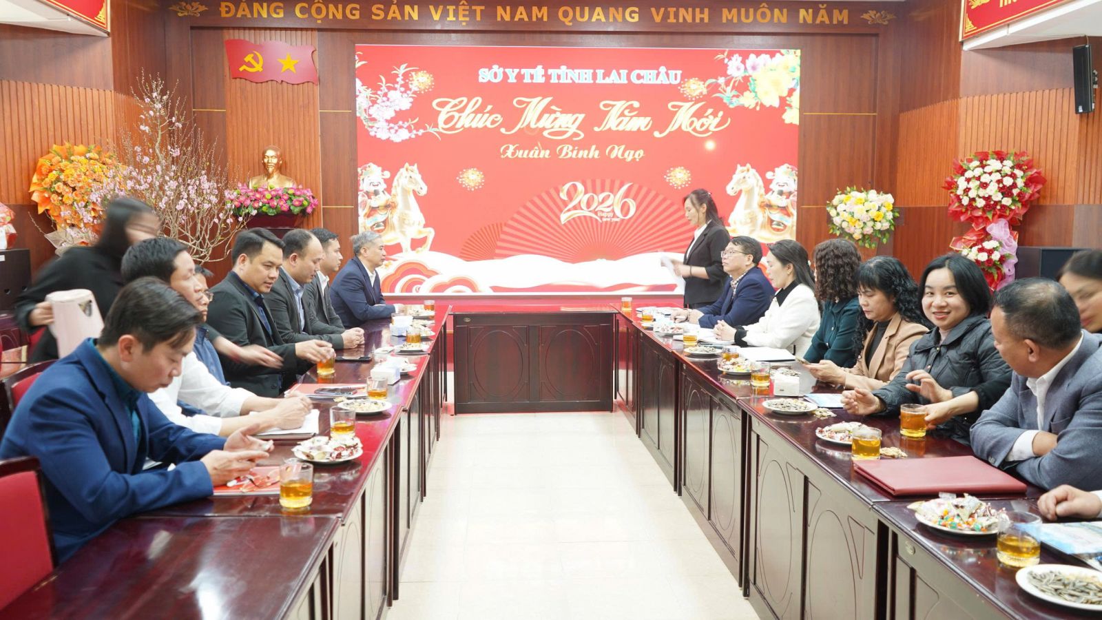 Tại đây, TTƯT, BSCKII Nguyễn Thị Hương - Phó Giám đốc Sở Y tế gửi lời chúc tốt đẹp đến toàn thể cán bộ, viên chức, người lao động của Trường nhân dịp xuân Bính Ngọ 2026, đồng thời, bày tỏ niềm tin tưởng vào sự phát triển lớn mạnh của Trường để tiếp tục thực hiện tốt nhiệm vụ đào tạo nguồn nhân lực cho tỉnh Lai Châu. Thời gian tới, ngành Y tế Lai Châu mong muốn phía nhà trường tiếp tục quan tâm, tạo điều kiện, phối hợp chặt chẽ, hỗ trợ tích cực và hiệu quả trong công tác đào tạo ngắn hạn, dài hạn về chuyên môn, nâng cao trình độ, chuyên môn kỹ thuật cho đội ngũ cán bộ y, bác sĩ, cũng như nghiên cứu khoa học…