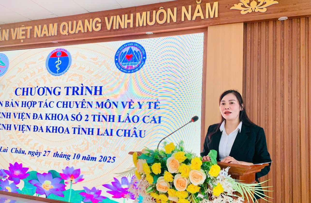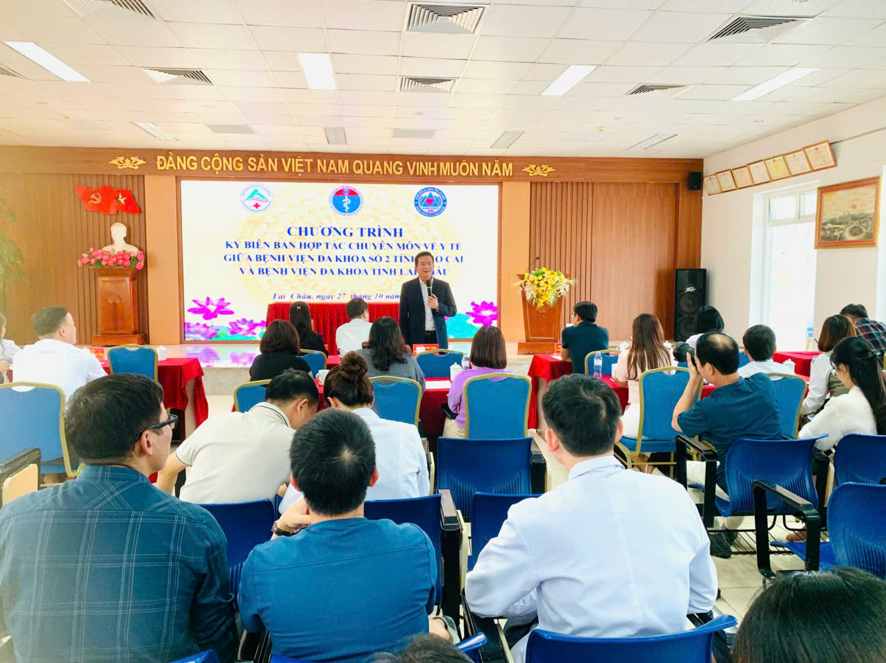 Chiều 27/10, Bệnh viện Đa khoa tỉnh Lai Châu phối hợp với Bệnh viện Đa khoa số 2 tỉnh Lào Cai tổ chức chương trình ký biên bản hợp tác chuyên môn về Y tế giữa 2 bệnh viện. Dự buổi lễ có TTƯT. BSCKII. Nguyễn Thị Hương - Phó Giám đốc Sở Y tế; Ban Giám đốc cùng đội ngũ bác sĩ, điều dưỡng của hai bệnh viện.