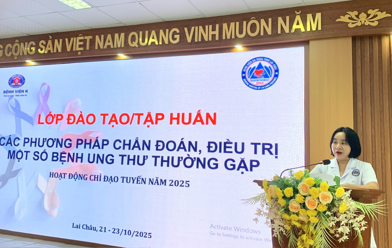 Từ ngày 21đến ngày 23/10, Bệnh viện đa khoa tỉnh Lai Châu phối hợp với Bệnh viện K tổ chức lớp đào tạo các phương pháp chẩn đoán, điều trị một số bệnh ung thư thường gặp. Dự lớp tập huấn có Ths, Bác sỹ Nguyễn Thanh Thủy - Phó giám đốc Bệnh viện Đa khoa tỉnh, đoàn công tác Bệnh viện K và 32 cán bộ Bệnh viện đa khoa tỉnh.