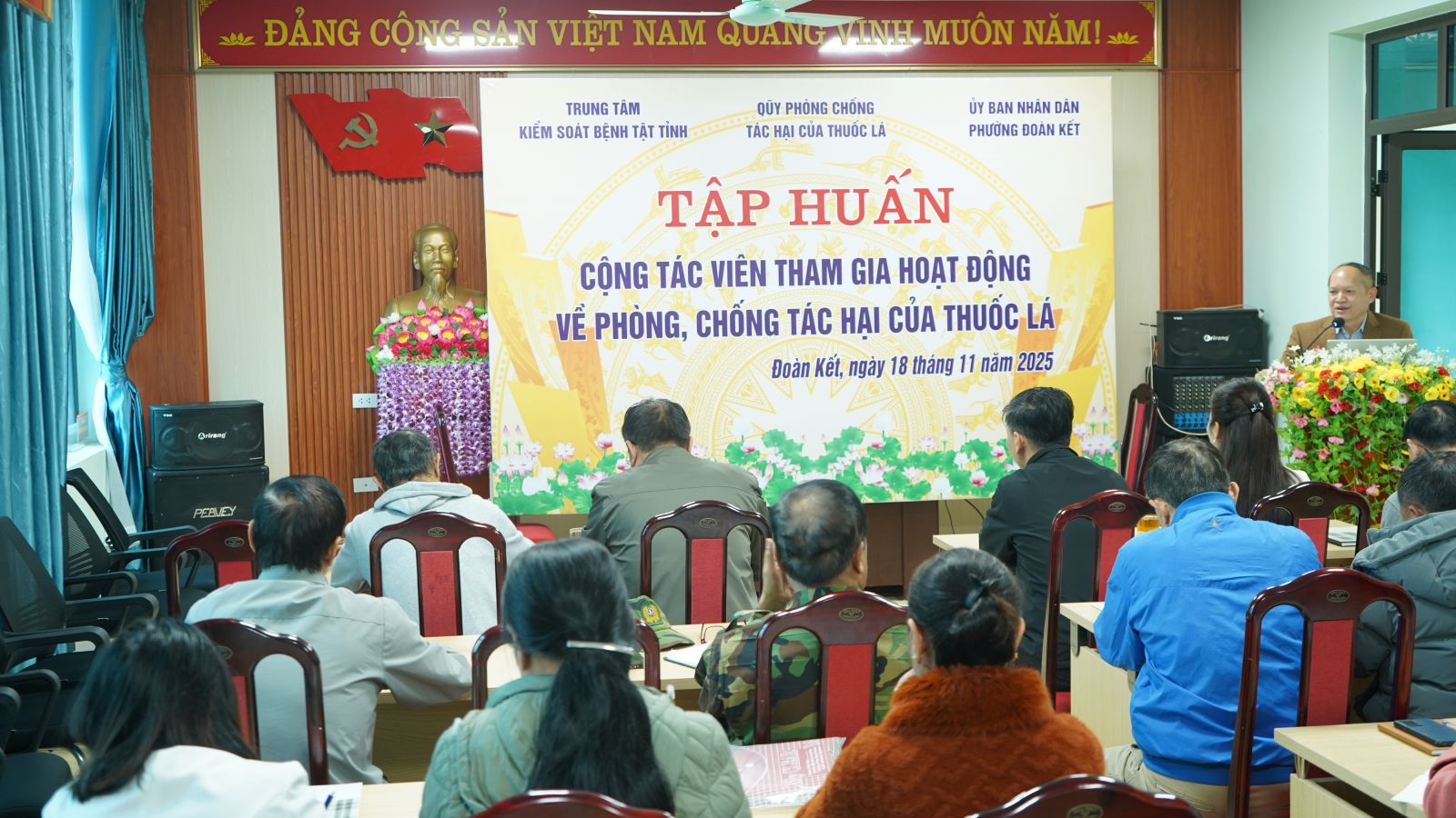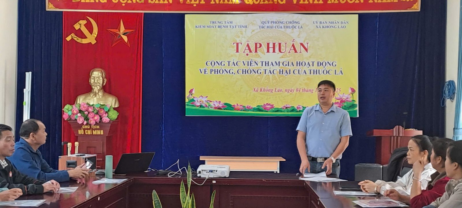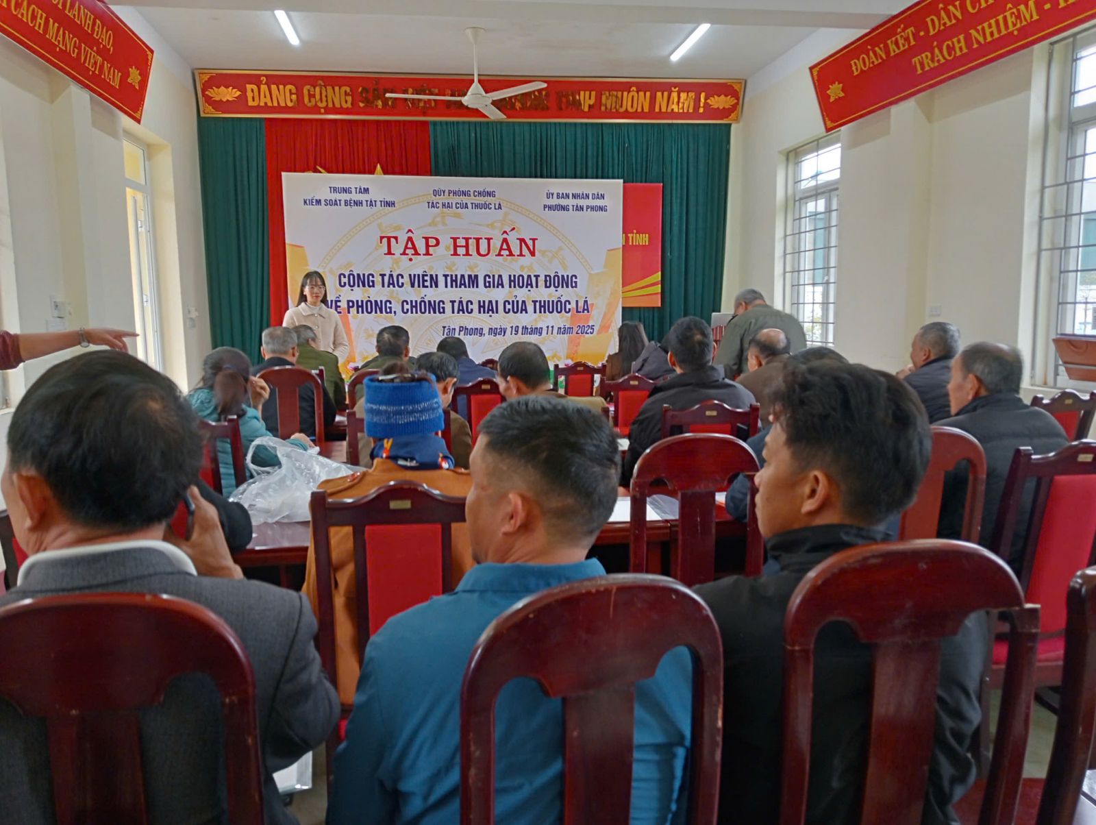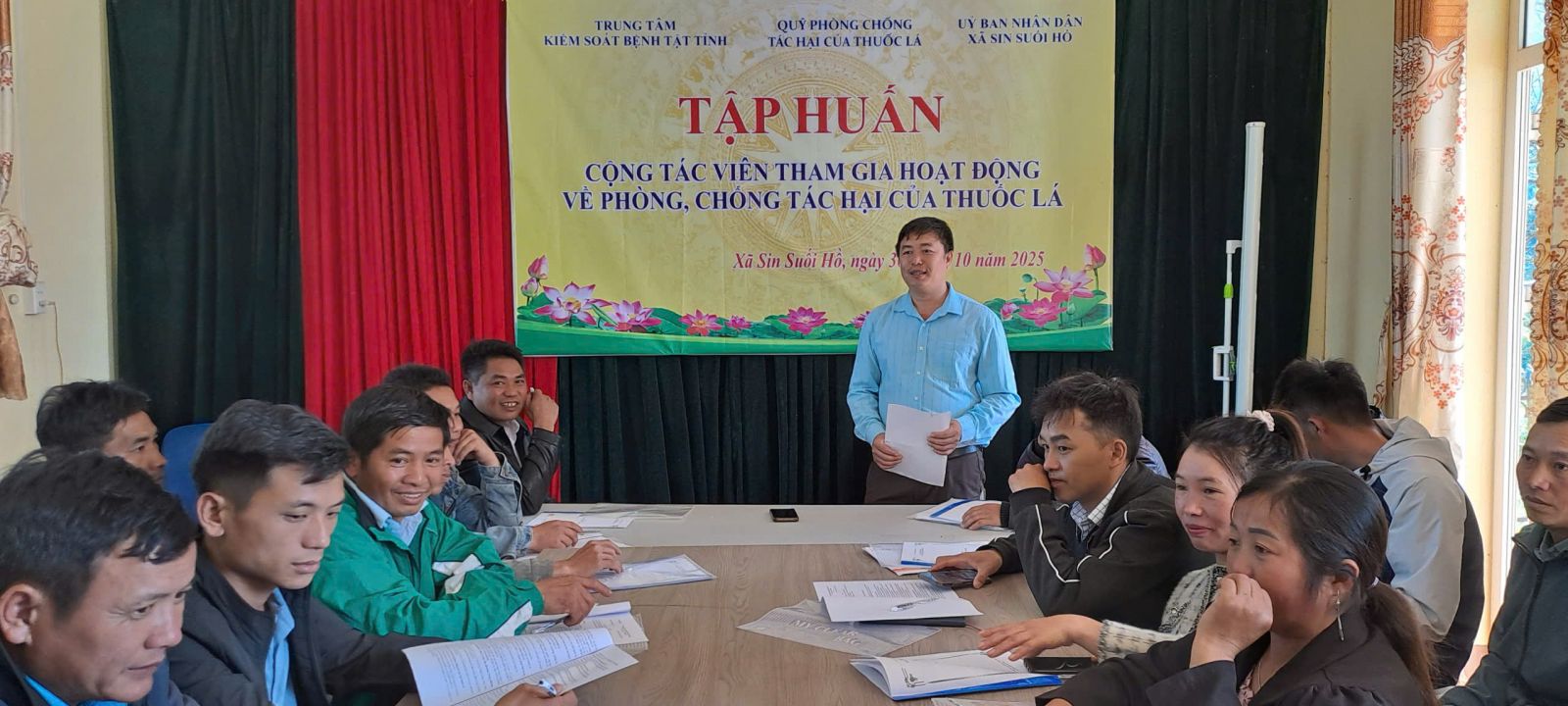 Từ ngày 20/10 đến gày 19/11, Trung tâm Kiểm soát bệnh tật tỉnh phối hợp cùng Trung tâm Y tế và UBND các xã, phường: Nậm Tăm, Tủa Sín Chải, Hồng Thu, Sin Suối Hồ, Khổng Lào, Dào San, Bum Nưa, Bum Tở, Đoàn Kết, Tân Phong, tổ chức 10 lớp tập huấn cho cộng tác viên tham gia hoạt động về phòng, chống tác hại của thuốc lá, với tổng số 350 học viên là các tổ trưởng/phó tổ dân phố, bản, Mặt trận, Hội Cựu chiến binh, Người Cao tuổi, Hội nông dân, Hội phụ nữ, đoàn thanh niên… tại thôn, bản trên địa bàn xã, phường.