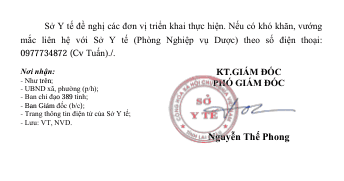 Sở Y tế đề nghị các đơn vị triển khai thực hiện. Nếu có khó khăn, vướng mắc liên hệ với Sở Y tế (Phòng Nghiệp vụ Dược) theo số điện thoại: 0977734872 (Cv Tuấn)./.