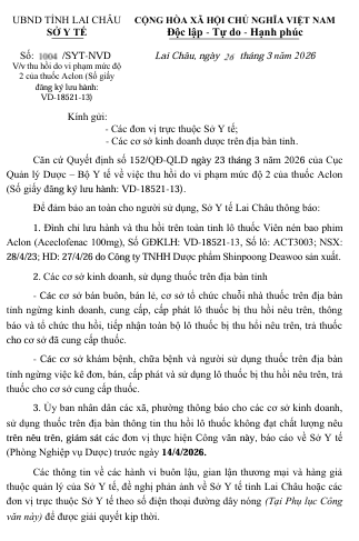 1. Đình chỉ lưu hành và thu hồi trên toàn tỉnh lô thuốc Viên nén bao phim Aclon (Aceclofenac 100mg), Số GĐKLH: VD-18521-13, Số lô: ACT3003; NSX: 28/4/23; HD: 27/4/26 do Công ty TNHH Dược phẩm Shinpoong Deawoo sản xuất.