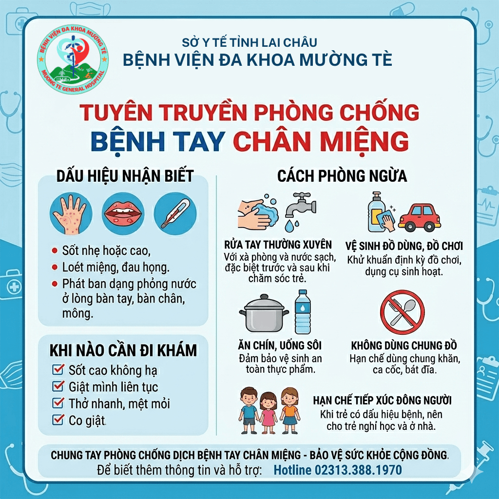 Hiện nay, thời tiết đang trong giai đoạn chuyển mùa, tạo điều kiện thuận lợi cho virus gây bệnh Tay chân miệng (TCM) phát triển mạnh, đặc biệt là ở nhóm trẻ dưới 5 tuổi. Nhằm chủ động kiểm soát tình hình dịch bệnh và bảo vệ sức khỏe cộng đồng, Bệnh viện Đa khoa huyện Mường Tè khuyến cáo các bậc phụ huynh và cơ sở giáo dục mầm non cần nâng cao cảnh giác.