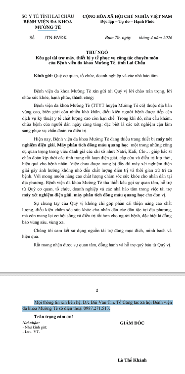 Thư ngỏ Bệnh viện Đa khoa Mường Tè kêu gọi tài trợ máy, thiết bị y tế phục vụ công tác chuyên môn.