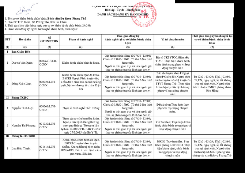 | Tiêu đề văn bản | Danh sách hành nghề khám bệnh , chữa bệnh Bệnh viện Đa khoa Phong thổ | ||