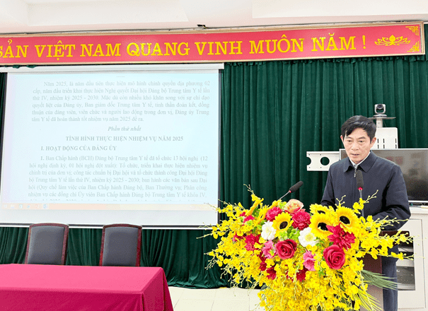 Đồng chí: Lê Vũ Cương - Phó Bí thư Đảng ủy Bệnh viện Đa khoa- Báo cáo tổng kết tình hình thực hiện nhiệm vụ công tác Đảng năm 2025; phương hướng nhiệm vụ năm 2026.