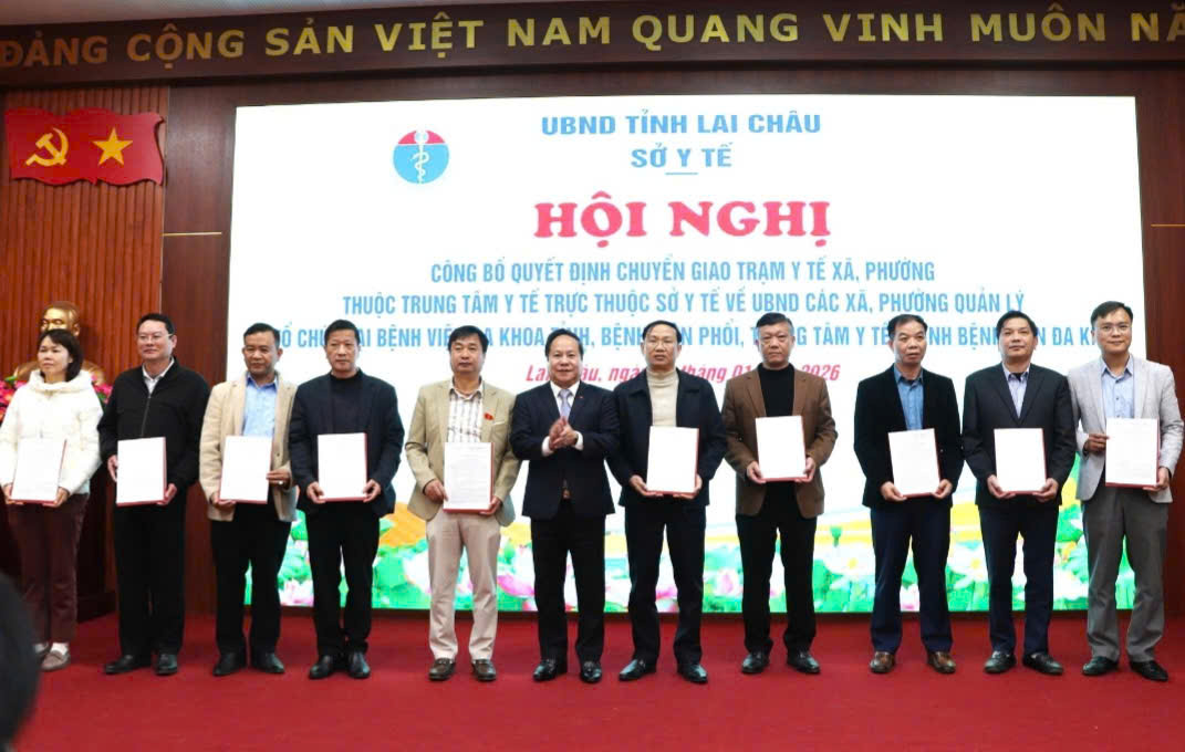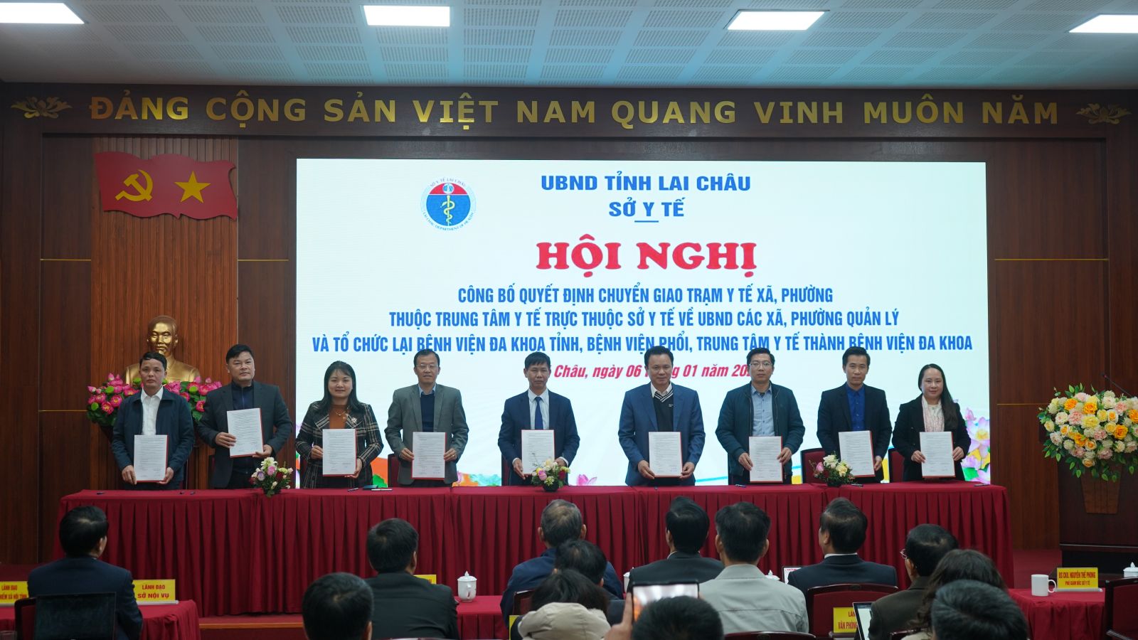Cũng tại Hội nghị, lãnh đạo Sở Y tế công bố các Quyết định của UBND tỉnh về việc tổ chức lại các đơn vị sự nghiệp y tế, gồm: Quyết định số 3233/QĐ-UBND về việc tổ chức lại Bệnh viện Đa khoa tỉnh Lai Châu; Quyết định số 3236/QĐ-UBND về việc tổ chức lại Bệnh viện Phổi tỉnh Lai Châu; Quyết định số 3241/QĐ-UBND về việc tổ chức lại Trung tâm Y tế Than Uyên; Quyết định số 3242/QĐ-UBND về việc tổ chức lại Trung tâm Y tế Tân Uyên; Quyết định số 3243/QĐ-UBND về việc tổ chức lại Trung tâm Y tế Tam Đường; Quyết định số 3244/QĐ-UBND về việc tổ chức lại Trung tâm Y tế Phong Thổ; Quyết định số 3245/QĐ-UBND về việc tổ chức lại Trung tâm Y tế Sìn Hồ; Quyết định số 3246/QĐ-UBND về việc tổ chức lại Trung tâm Y tế Mường Tè; Quyết định số 3247/QĐ-UBND về việc tổ chức lại Trung tâm Y tế Nậm Nhùn; Quyết định số 3248/QĐ-UBND về việc tổ chức lại Trung tâm Y tế Lai Châu và Trung tâm Y tế Sìn Hồ cơ sở 2 để thành lập Bệnh viện Đa khoa Pa Há thuộc Sở Y tế.