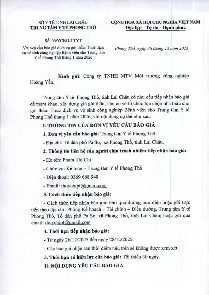 | Tiêu đề văn bản | V/v yêu cầu báo giá dịch vụ gói thầu: Thuê dịch vụ vệ sinh công nghiệp Bệnh viện cho Trung tâm Y tế Phong Thổ tháng 1 năm 2026 | ||