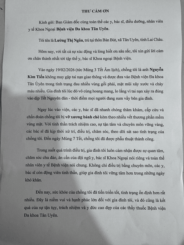 Trong thư cảm ơn gửi tới Ban Giám đốc và tập thể Khoa Ngoại, người nhà bệnh nhân bày tỏ sự xúc động, biết ơn trước tinh thần trách nhiệm, thái độ ân cần, chu đáo của đội ngũ cán bộ y tế. Những lời cảm ơn mộc mạc nhưng chân thành đầu xuân mới chính là nguồn động viên to lớn, tiếp thêm động lực để đội ngũ thầy thuốc tiếp tục nỗ lực, cống hiến vì sức khỏe nhân dân.