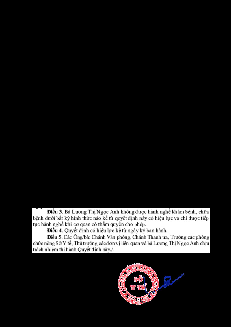 | Tiêu đề văn bản | Quyết định Thu hồi Giấy phép hành nghề khám bệnh, chữa bệnh của bà Lương Thị Ngọc Anh | ||