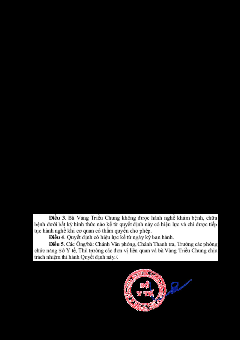 | Tiêu đề văn bản | Quyết định Thu hồi Giấy phép hành nghề khám bệnh, chữa bệnh của bà Vàng Chiều Trung | ||